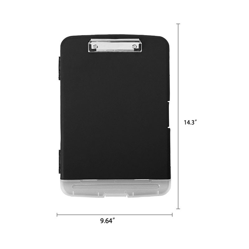 Elevate your efficiency with our sophisticated A4 Clipboard Organizer. With dimensions of 14.3" x 9.64" this compact yet powerful tool is tailor-made for professionals, students, and anyone who thrives on organization while on the move. The sleek design includes a robust low-profile clip to keep your documents secure, alongside an ample internal compartment for neatly storing pens, notebooks, forms, and other essentials. Whether you're out in the field, attending meetings, or working in a classroom, this clipboard is the perfect companion for maintaining a tidy workspace.