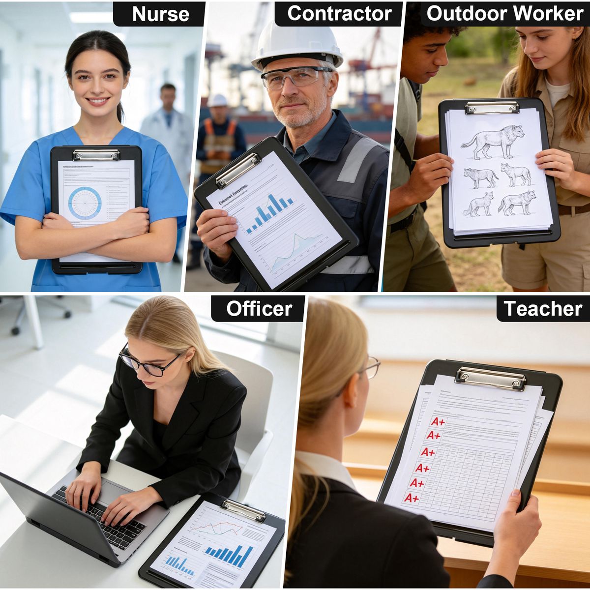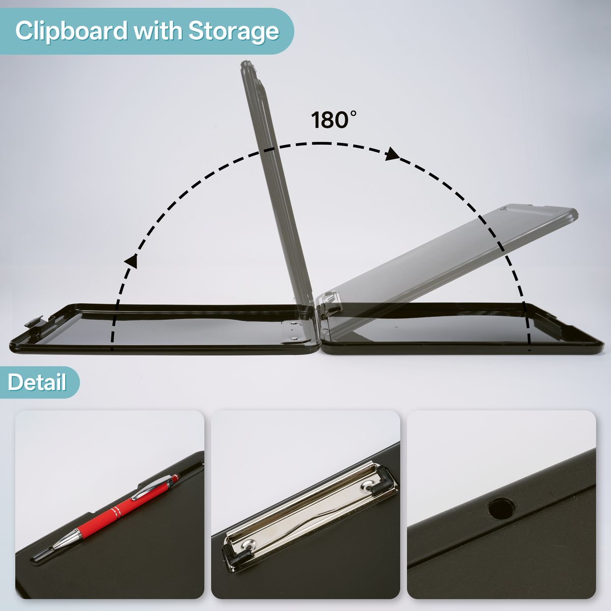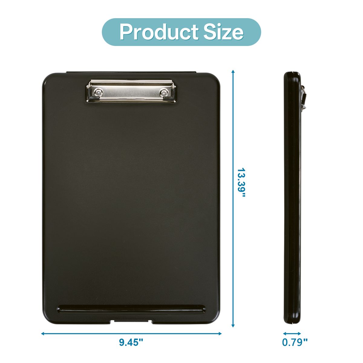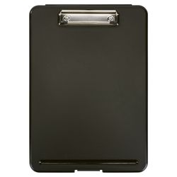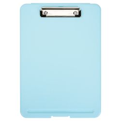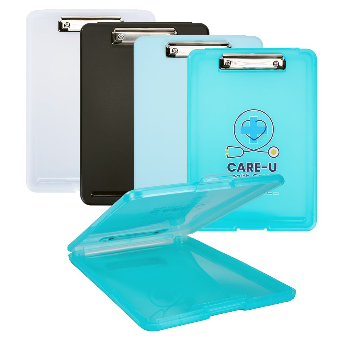 The plastic storage clipboard is your go-to solution for notes and document storage. Designed to hold up to 9" x 12" papers, it features a sturdy metal clip for secure paper holding. Available in four colors — black and light blue in solid opaque finishes, blue green and clear in frosted translucent styles — it fits both professional and modern looks. Ideal for nurses, office staff, and delivery personnel, its durable plastic construction ensures long-lasting use. Custom logo imprinting is available, making it perfect for promotions and giveaways.